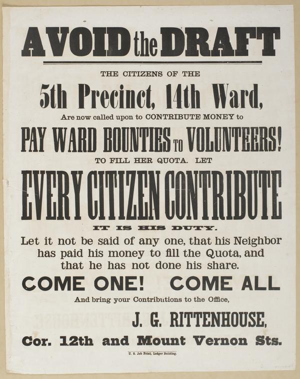 Avoid the draft : The citizens of the 5th Precinct, 14th Ward, are now called upon to contribute money to pay ward bounties to volunteers! To fill her quota. Let every citizen contribute It is his duty. Let it not be said of any one, that his neighbor has paid his money to fill the quota, and that he has not done his share. Come one! Come all and bring your contributions to the office, / J.G. Rittenhouse, cor. 12th and Mount Vernon Sts.
