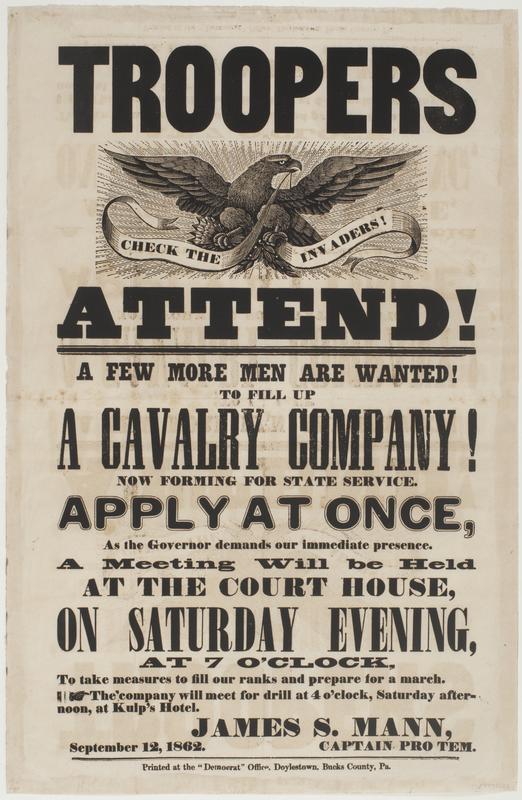 Troopers attend! A few more men are wanted! : To fill up a cavalry company! Now forming for state service. Apply at once, as the governor demands our immediate presence. A meeting will be held at the court house, on Saturday evening, at 7 o'clock, to take measures to fill our ranks and prepare for a march. The company will meet for drill at 4 o'clock, Saturday afternoon, at Kulp's Hotel. / James S. Mann, Captain Pro Tem. September 12, 1862.