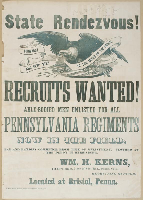 State rendezvous! Recruits wanted! : Able-bodied men enlisted for all Pennsylvania regiments now in the field. Pay and rations commence from time of enlistment. Clothed at the depot in Harrisburg. / Wm. H. Kerns, 1st Lieutenant, (late of 71st Reg., Penna. Vols.,) recruiting officer. Located at Bristol, Penna.