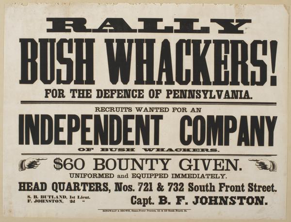 Rally bush whackers! For the defence of Pennsylvania. : Recruits wanted for an independent company of bush whackers. $60 bounty given. Uniformed and equipped immediately. Head quarters, Nos. 721 & 732 South Front Street. / S.B. Butland, 1st Lieut. F. Johnston, 2d " Capt. B.F. Johnston.