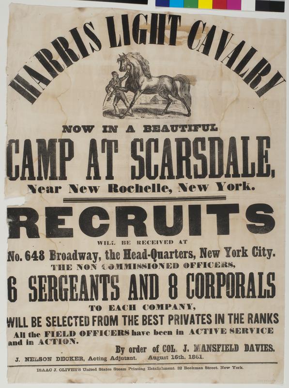 Harris Light Cavalry : now in a beautiful camp at Scarsdale, near New Rochelle, New York. Recruits will be received at No. 648 Broadway, the head-quarters, New York City. The non commissioned officers, 6 sergeants and 8 corporals to each company, will be selected from the best privates in the ranks All the field officers have been in active service and in action. / By order of Col. J. Mandsfield Davies. J. Nelson Decker, acting adjutant. August 16th, 1861.