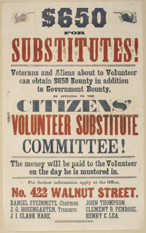 $650 for substitutes! Veterans and aliens about to volunteer can obtain $650 bounty in addition to government bounty, by applying to the Citizens' Volunteer Substitute Committee! : The money will be paid to the volunteer on the day he is mustered in. For further information apply at the office, No. 422 Walnut Street. / Daniel Steinmetz, chairman. J.G. Rosengarten, treasurer. J.I. Clark Hare. John Thompson. Clement B. Penrose. Henry C. Lea.