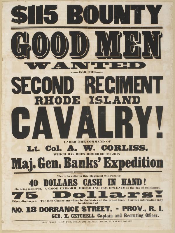 $115 bounty Good men wanted for the Second Regiment Rhode Island Cavalry! : Under the command of Lt. Col. A.W. Corliss, which has been ordered to join Maj. Gen. Banks' expedition Men who enlist in this regiment will receive 40 dollars cash in hand! on being mustered. A good uniform, horse and equipments on the day of enlistment. 75 dollars! when discharged. The best chance anywhere in the states at the present time. Further information may be obtained at No. 18 Dorrance Street, - Prov., R.I. / Geo. H. Getchell, Captain and recruiting officer.