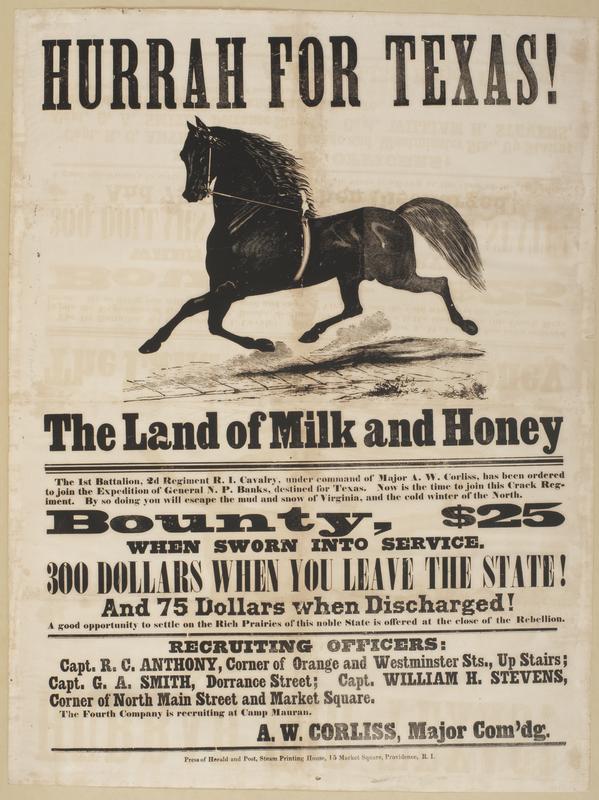 Hurrah for Texas! The land of milk and honey : The 1st Battalion, 2d Regiment R.I. Cavalry, under command of Major A.W. Corliss, has been ordered to join the expedition of General N.P. Banks, destined for Texas. Now is the time to join this crack regiment. By doing so you will escape the mud and snow of Virginia, and the cold winter of the north. Bounty, $25 when sworn into service. 300 dollars when you leave the state! And 75 dollars when discharged! A good opportunity to settle on the rich prairies of this noble state is offered at the close of the rebellion. / Recruiting officers: Capt. R.C. Anthony, corner of Orange and Westminster Sts., up stairs; Capt. G.A. Smith, Dorrance Street; Capt. William H. Stevens, corner of North Main Street and Market Square. The Fourth Company is recruiting at Camp Mauran. A.W. Corliss, Major com'dg.