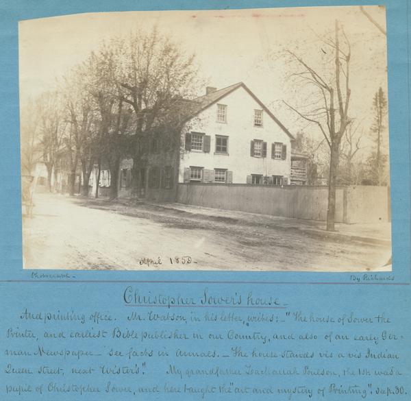 Christopher Sower's house - [graphic] : And printing office. Mr. Watson, in his letter writes: "The house of Sower the printer, and earliest Bible publisher in our country, and also of an early German newspaper - See facts in Annals. The house stands vis a vis Indian Queen Street, next Wister's." My grandfather Zachariah Poulson, the 1st, was a pupil of Christopher Sower, and here taught the "art and mystery of Printing" / Photograph by Richards.