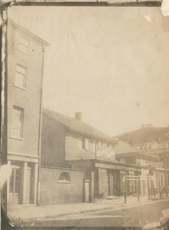 Shows the former school building of the Friends' Academy, erected in 1744, rebuilt in 1803, and razed in 1859, boarded up for demolition on the 100 block of South 4th Street. Building adorned with signage promoting a "stationery and printing" shop. Also shows adjacent businesses G. Krouse, gas fitter (117 S. 4th); Quaker City Bag Factory; and Moses Thomas & Sons, auctioneers (139-141 S. 4th). Friends' Academy, established in 1689 by the Religious Society of Friends, suspended operations in 1842 and was re-established as the William Penn Charter School in 1875.