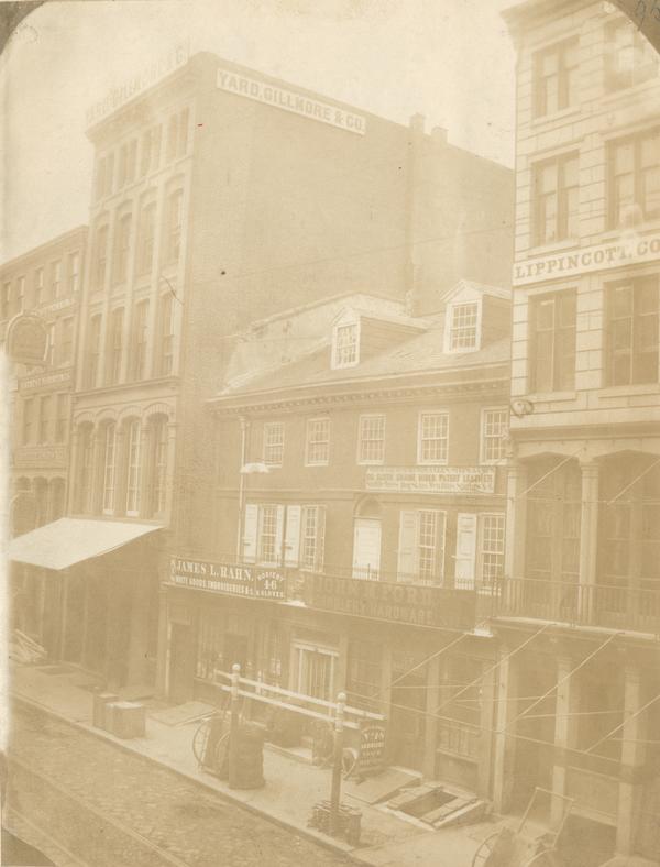by the businesses of James L. Rahn, hosiery & gloves, and John M. Ford, saddlery hardware, at 46-48 N. 3rd Street above Market