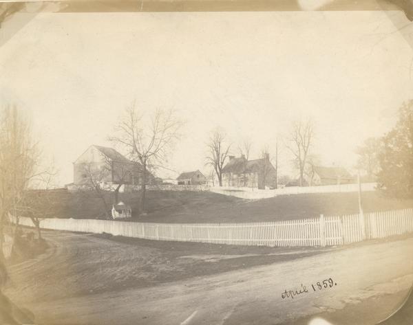 Shows the former residence of Thomas Godfrey, inventor of the mariner's quadrant. Farm surrounded by a white picket fence.