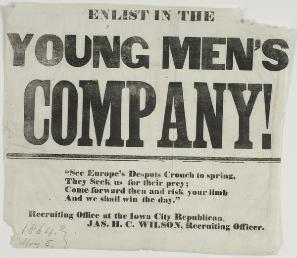 Enlist in the young men's company! : "See Europe's despots crouch to spring, They seek us for their prey; Come forward then and risk your limb And we shall win the day." Recruiting office at the Iowa City Republican. / Jas. H.C. Wilson, recruiting officer.