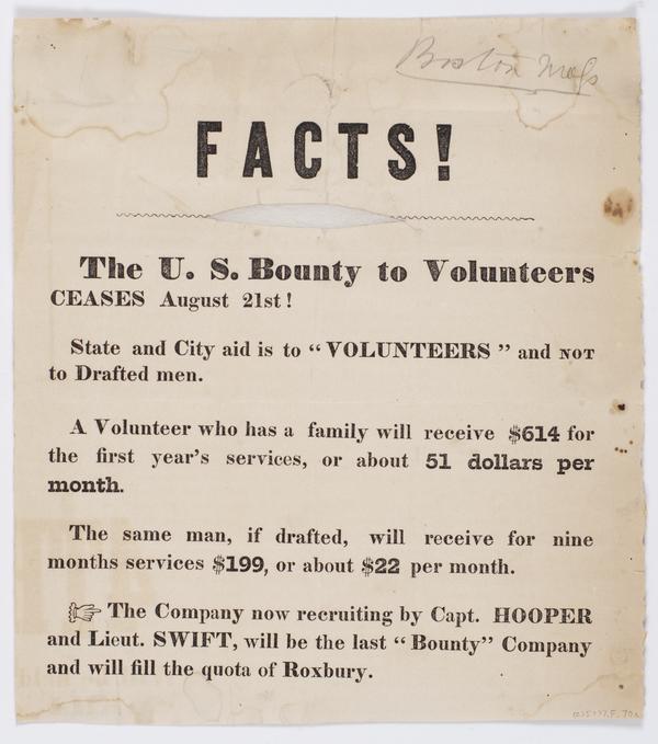 Facts! The U.S. bounty to volunteers ceases August 21st! : State and city aid is to "volunteers" and not to drafted men. A volunteer who has a family will receive $614 for the first year's services, or about 51 dollars per month. The same man, if drafted, will receive for nine months services $199, or about $22 per month. The company now recruiting by Capt. Hooper and Lieut. Swift, will be the last "bounty" company and will fill the quota of Roxbury.