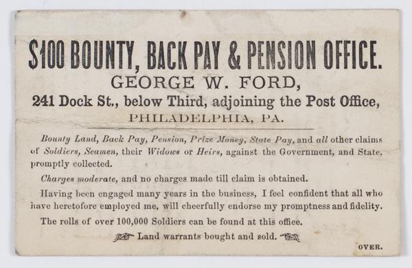 $100 bounty, back pay & pension office. / George W. Ford, 241 Dock St., below Third, adjoining the post office, Philadelphia, Pa. Bounty land, back pay, pension, prize money, state pay, and all other claims of soldiers, seamen, their widows or heirs, against the government, and state, promptly collected. Charges moderate, and no charges made till claim is obtained. ...