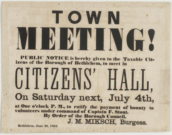 Town meeting! : Public notice is hereby given to the taxable citizens of the borough of Bethlehem, to meet in Citizens' Hall, on Saturday next, July 4th, at one o'clock p.m., to ratify the payment of bounty to volunteers under command of Captain F. Stout. / By order of the Borough Council. J.M. Miksch, burgess. Bethlehem, June 30, 1863.