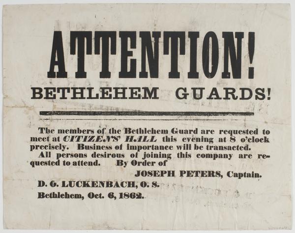 Attention! Bethlehem Guards! : The members of the Bethlehem Guard are requested to meet at Citizens' Hall this evening at 8 o'clock precisely. Business of importance will be transacted. All persons desirous of joining this company are requested to attend. / By order of Joseph Peters, Captain. D.O. Luckenbach, O.S. Bethlehem, Oct. 6, 1862.