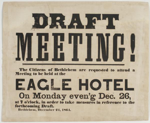 Draft meeting! : The citizens of Bethlehem are requested to attend a meeting to be held at the Eagle Hotel on Monday even'g Dec. 26, at 7 o'clock, in order to take measures in reference to the forthcoming draft. Bethlehem, December 24, 1864.