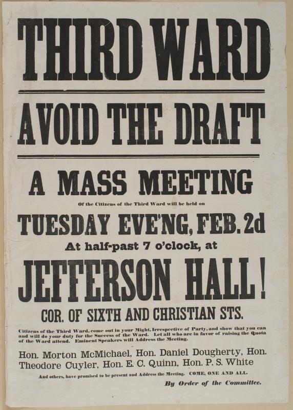 Third Ward avoid the draft : A mass meeting of the citizens of the Third Ward will be held on Tuesday eve'ng, Feb. 2d at half-past 7 o'clock, at Jefferson Hall! Cor. of Sixth and Christian Sts. Citizens of the Third Ward, come out in your might, irrespective of party, and show that you can and will do your duty for the success of the ward. Let all who are in favor of raising the quota of the ward attend. Eminent speakers will address the meeting. Hon. Morton McMichael, Hon. Daniel Dougherty, Hon Theodore Cuyler, Hon. E.C. Quinn, Hon. P.S. White and others, have promised to be present and address the meeting. Come, one and all. / By order of the committee.
