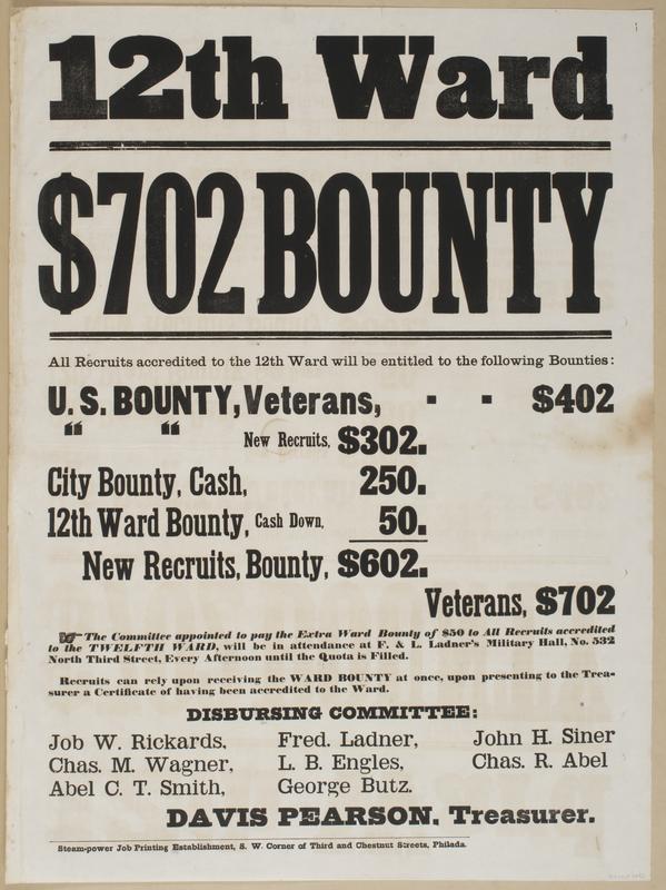 12th Ward $702 bounty : All recruits accredited to the 12th Ward will be entitled to the following bounties: ... The committee appointed to pay the extra ward bounty of $50 to all recruits accredited to the Twelfth Ward, will be in attendance at F. & L. Ladner's Military Hall, No. 532 North Third Street, every afternoon until the quota is filled. Recruits can rely upon receiving the ward bounty at once, upon presenting to the treasurer a certificate of having been accredited to the ward. Disbursing Committee: Job W. Rickards, ... Davis Pearson, treasurer.