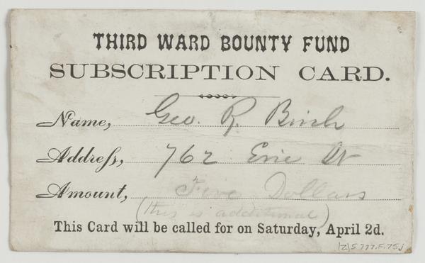 Third Ward Bounty Fund subscription card. : Name, [blank] Address, [blank] Amount, [blank] This card will be called for on Saturday, April 2d.