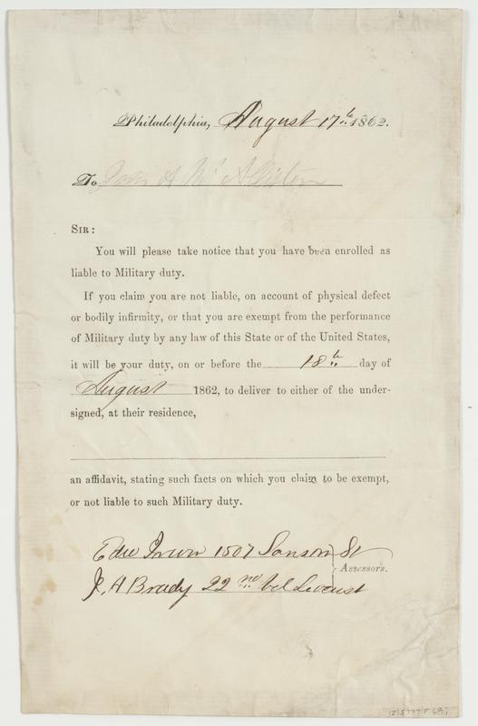 Philadelphia, [blank] 1862. To [blank] : Sir: You will please take notice that you have been enrolled as liable to military duty. If you claim you are not liable, on account of physical defect or bodily infirmity, or that you are exempt from the performance of military duty by any law of this state or of the United States, it will be your duty, on or before the [blank] day of [blank] 1862, to deliver to either of the undersigned, at their residence, [blank] an affidavit, stating such facts on which you claim to be exempt, or not liable to such military duty. [blank] [blank] assessors.
