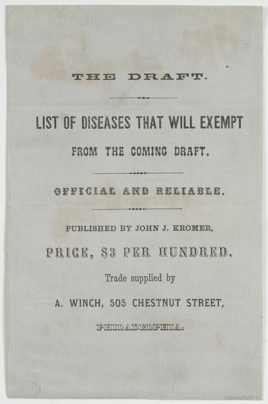 The draft. List of diseases that will exempt from the coming draft. : Official and reliable. / Published by John J. Kromer, price $3 per hundred. Trade supplied by A. Winch, 505 Chestnut Street, Philadelphia.