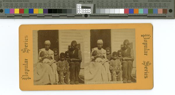 Racist scene showing an African American family of a mother, father, and four children seated on the porch to a wooden dwelling. In the left, the mother breastfeeds her youngest child, a baby. She is seated next to her three older, but young children. The father sits to the right on the other side of the children who sit and stand. He has his arm behind the next to youngest child. The mother is attired in a kerchief, plain shirtwaist, and long, plain skirt. The father wears a vest, shirt sleeves, pants, and work boots. The children are attired in worn shirts and the oldest also in worn pants.