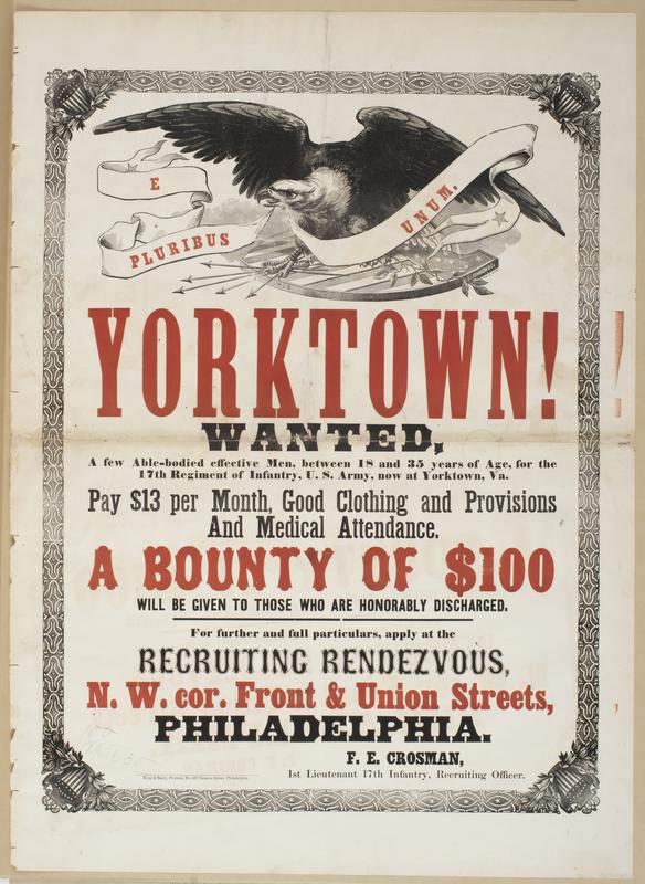 Yorktown! : Wanted, a few able-bodied men, between 18 and 35 years of age, for the 17th Regiment of Infantry, U.S. Army, now at Yorktown, Va. Pay $13 per month, good clothing and provisions and medical attendance. A bounty of $100 will be given to those who are honorably discharged. For further and full particulars, apply at the recruiting rendezvous, N.W. cor. Front & Union Streets, Philadelphia. / F.E. Crosman, 1st Lieutenant 17th Infrantry, recruiting officer.