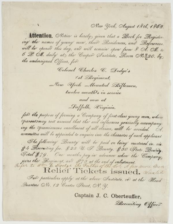 New York, August 18th, 1862. : Attention. Notice is hereby given that a book for registering the names of young men, their residences, and references, will be opened this day, and will remain open from 8 a.m. to 6 p.m. daily at the Cooper Institute, Room No. 20. by the undersigned officer, for Colonel Charles C. Dodge's 1st Regiment, New York Mounted Riflemen, twelve month's in service and now at Suffolk, Virginia. For the purpose of forming a company of first-class young men, whose parents may rest assured that the evil influences generally accompanying the promiscuous enrollment of all classes, will be avoided. A committee will be appointed to enquire into the character of each applicant. The following bounty will be paid on being mustered in. viz. $4 recruiting fee. $25 U.S. bounty. $50 state bounty, total $79. One month's pay in advance when the company joins the regiment, and $75 at the end of enlistment. Relief tickets issued. For particulars apply at the above Institute, or at the head quarters No. 12 Centre Street, N.Y. / Captain J.C. Oberteuffer, recruiting officer.