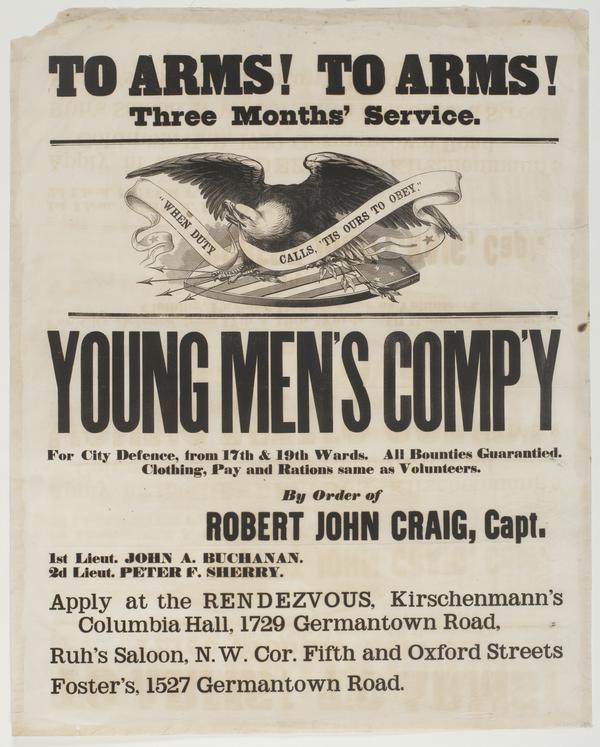 To arms! To arms! Three months' service. : Young men's comp'y for city defence, from 17th & 19th wards. All bounties guarantied. Clothing, pay and rations same as volunteers. / By order of Robert John Craig, Capt. 1st Lieut. John A. Buchanan. 2d Lieut. Peter F. Sherry. Apply at the rendezvous, Kirschenmann's Columbia Hall, 1729 Germantown Road, Ruh's Saloon, N.W. cor. Fifth and Oxford Streets Foster's, 1527 Germantown Road.