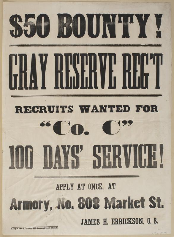 $50 bounty! Gray Reserve Reg't Recruits wanted for "Co. C" 100 days' service! : Apply at once, at Armory, No. 808 Market St. James H. Errickson, O.S.