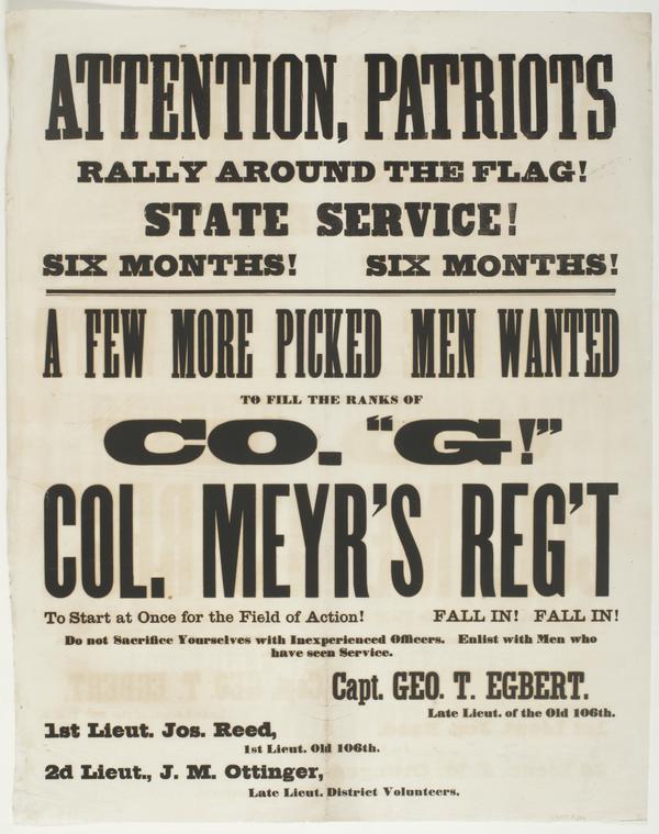 Attention, patriots Rally around the flag! : State service! Six months! Six months! A few more picked men wanted to fill the ranks of Co. "G!" Col. Meyr's [sic] reg't To start at once for the field of action! Fall in! Fall in! Do not sacrifice yourselves with inexperienced officers. Enlist with men who have seen service. / Capt. Geo. T. Egbert. Late Lieut. of the old 106th. 1st Lieut. Jos. Reed, 1st Lieut. old 106th. 2d Lieut., J.M. Ottinger, late Lieut. District Volunteers.