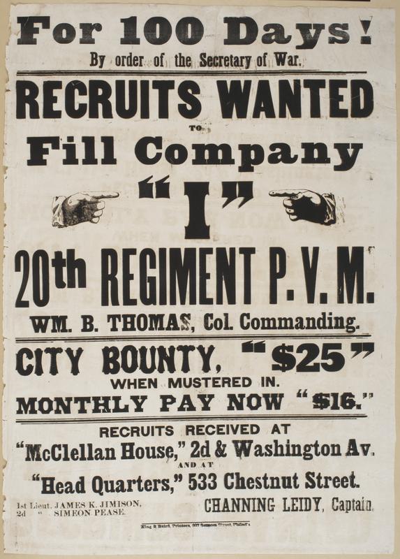 For 100 days! By order of the Secretary of War. : Recruits wanted to fill Company "I" 20th Regiment P.V.M. Wm. B. Thomas, Col. commanding. City bounty, "$25" when mustered in. Monthy pay now "$16." Recruits received at "McClellan House," 2d & Washington Av. and at "Head quarters," 533 Chestnut Street. / 1st Lieut. James K. Jimison, 2d " Simeon Pease. Channing Leidy, Captain.