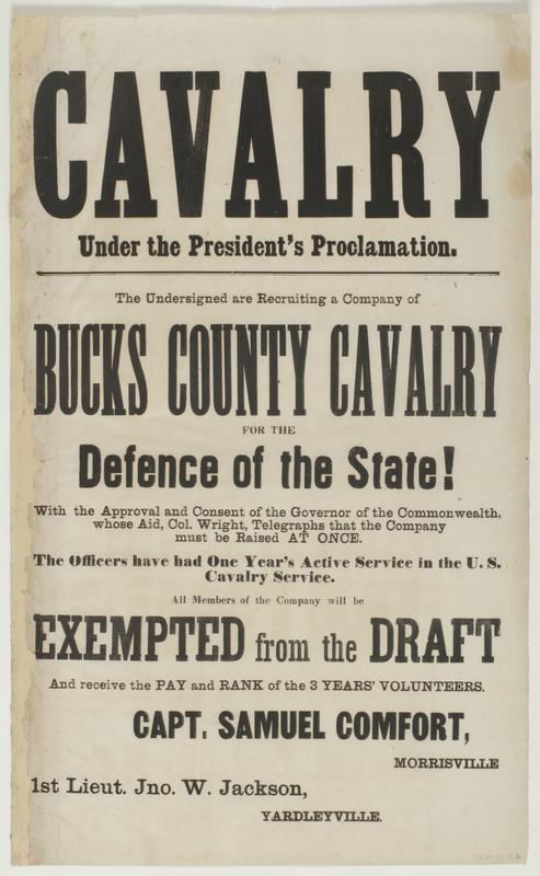 Cavalry under the president's proclamation. : The undersigned are recruiting a company of Bucks County Cavalry for the defence of the state! With the approval and consent of the governor of the commonwealth, whose aid, Col. Wright, telegraphs that the company must be raised at once. The officers have had one year's active service in the U.S. Cavalry Service. All members of the company will be exempted from the draft and receive the pay and rank of the 3 years' volunteers. / Capt. Samuel Comfort, Morrisville 1st Lieut. Jno. W. Jackson, Yardleyville.