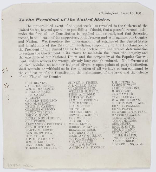 Philadelphia, April 15, 1861. To the president of the United States. : The unparalleled event of the past week has revealed to the citizens of the United States, beyond question or possibility of doubt, that a peaceful reconciliation under the form of our Constitution, is repelled and scorned, and that secession means, in the hearts of its supporters, both treason and war against our country and nation. We, therefore, the undersigned, loyal citizens of the United States and inhabitants of the city of Philadelphia, responding to the proclamation of the president of the United States, hereby declare our unalterable determination to sustain the government in its efforts to maintain the honor, the integrity and the existence of our national union ...