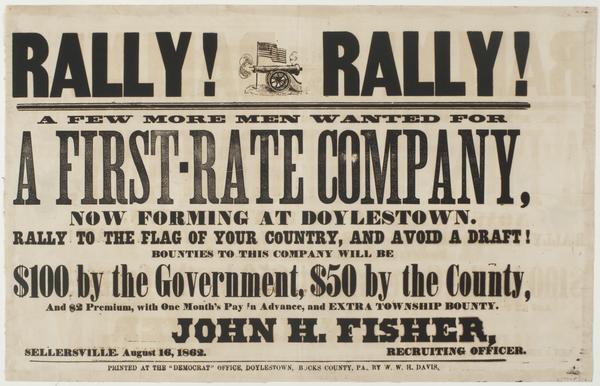 Rally! Rally! : A few more men wanted for a first-rate company, now forming at Doylestown. Rally to the flag of your country, and avoid a draft! Bounties to this company will be $100 by the government, $50 by the county, and $2 premium, with one month's pay in advance, and extra township bounty. / John H. Fisher, recruiting officer. Sellersville, August 16, 1862.