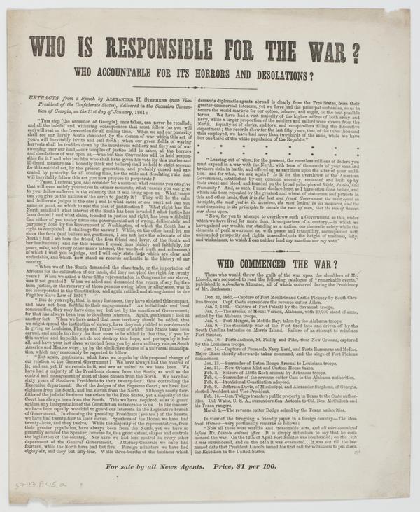 Who is responsible for the war? : Who accountable for its horrors and desolations? Extracts from a speech by Alexander H. Stephens (new vice-president of the Confederate States), delivered in the secession convention of Georgia, on the 31st day of January, 1861: ... Who commenced the war? ...