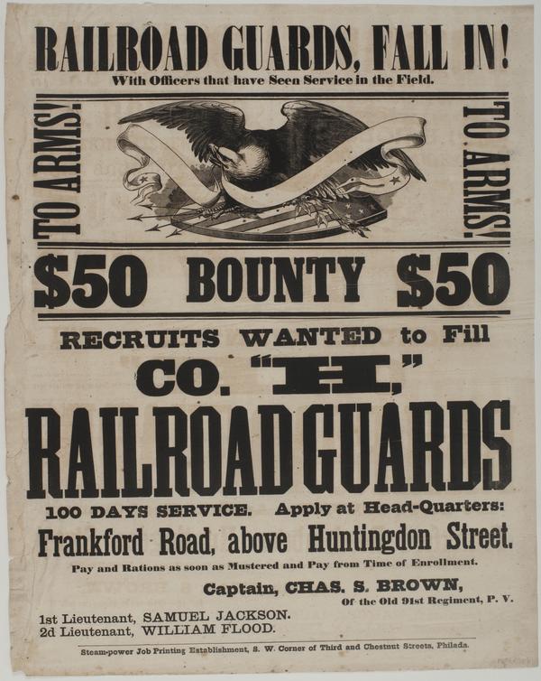 Railroad Guards, fall in! With officers that have seen service in the field. : To arms! To arms! $50 bounty $50 Recruits wanted to fill Co. "H," Railroad Guards 100 days service. Apply at head-quarters: Frankford Road, above Huntingdon Street. Pay and rations as soon as mustered and pay from time of enrollment. / Captain, Chas. S. Brown, of the old 91st Regiment, P.V. 1st Lieutenant, Samuel Jackson. 2d Lieutenant, William Flood.