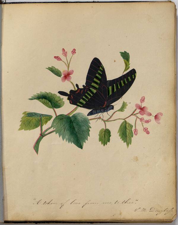 Album page containing a drawing of a black butterfly on a twig with pink flowers. Shows the butterfly with a black head, thorax, and abdomen and black wings with specks of green and red. The twig also contains several green leaves that fold up, fold down, and/or droop. The stem and branches of the twig are outlined with pink lines.