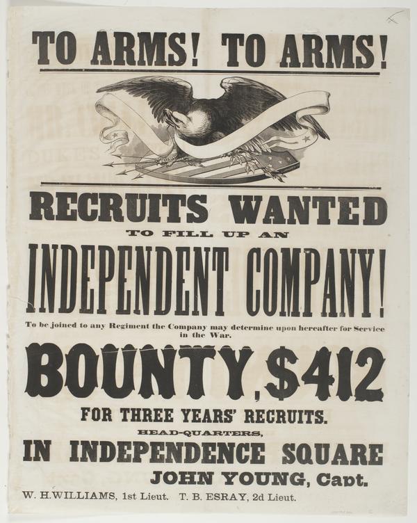 To arms! To arms! : Recruits wanted to fill up an independent company! To be joined to any regiment the company may determine upon hereafter for service in the war. Bounty, $412 for three years' recruits. Head-quarters, in Independence Square / John Young, Capt. W.H. Williams, 1st Lieut. T.B. Esray, 2d Lieut.