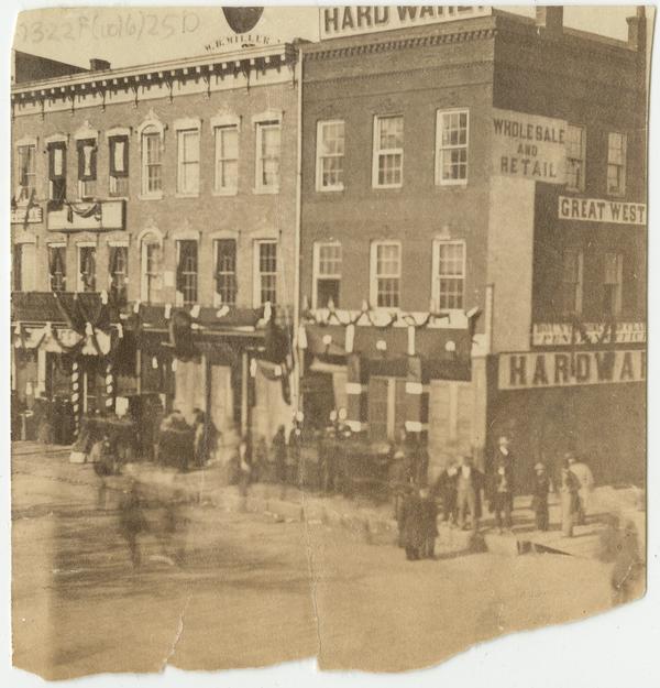 View showing mourners on the sidewalk in front of buildings, including a hardware store and the business of "H.R. Miller," decorated in black bunting in memory of the assassinated president.