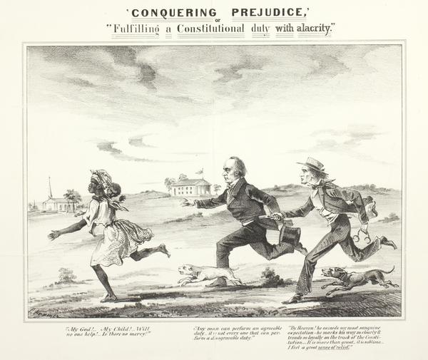 Antislavery print depicting the pursuit of a freedom seeker in accordance with the Fugitive Slave Law of 1850. Shows a barefooted, enslaved African American woman, portrayed with exaggerated features, and attired in a head kerchief and a short-sleeved dress. She runs holding her child and screams for help, "My God! My child! Will no one help! Is there no mercy!" Chasing her are Daniel Webster admiring himself for performing a "disagreeable duty," a marshal holding a gun and handcuffs and exclaiming a sense of relief over Webster's interpretation of the Constitution, and two dogs. In the background is a church and courthouse.