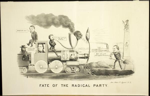 and Vice-Presidential nominee Schuyler Colfax. On the tracks in the background, an African American man, portrayed in racist