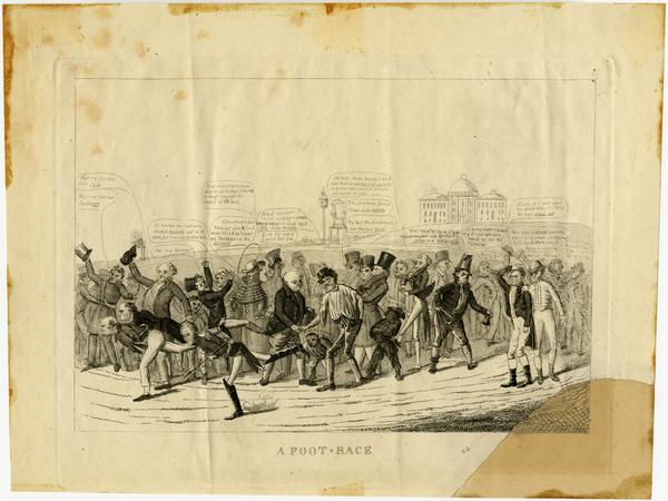 Henry Clay engaged in a foot race to win the presidency. A crowd cheers them on and remarks about the candidates reflecting