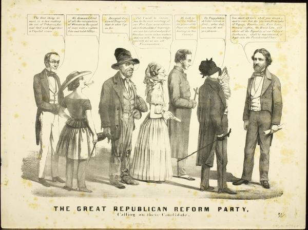 Cartoon lampooning the Republican Party's constituency of radicals and reformers who supported the first Republican presidential