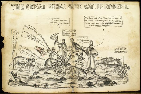 Cartoon depicting a pasture with a tree at the center that shows a white man growing from it. The man holds a paper entitled, "Coal is coal," and states that he needs his roots covered. On one of the branches, perches a figure with the body of a bird and the head of a man who states, "The rascally Whigs killed poor Cilley," a reference to the death of Maine Congressman Jonathan Cilley in a duel with Kentucky Congressman William J. Graves. Surrounding this figure are white men and cattle. In the right, a man attired in a long coat and top hat states that the cattle will not feed on "Rohans" and “if we could whip in the miserable conservatives, it would be really ‘contholing.’” Two other men scrounge on the ground, one labeled "Green Pear" who asks to be let up the "Rohan," and the other, who bemoans being overshadowed by the image of a bloody hand. In the left, an African American man portrayed in racist caricature speaks in the vernacular, “Hold on Massa Gineral, it be oh no use to go to dat market,” as he tries to reign in cattle with human heads that are labeled "Hampton Bull." In the right background, an onlooker warns a cattle driver who is being trampled that he can not drive them.