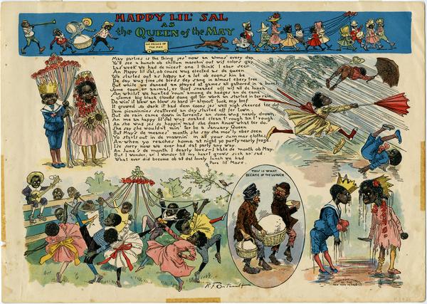 Racist cartoon containing vignettes about a group of African American children, portrayed in caricature, at a May Day party