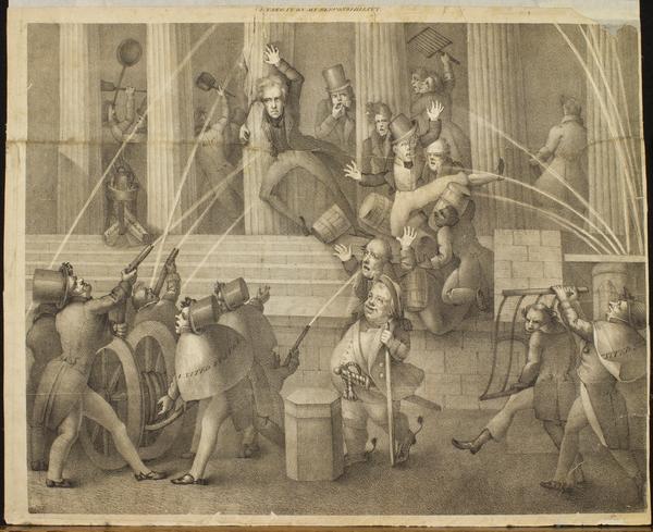 Cartoon critical of Andrew Jackson's decision to discontinue federal deposits to the Bank of the United States and his denial that his informal circle of close advisors, known as the "Kitchen Cabinet," influenced his decision. Depicts Jackson pinned to a column at the top of the stairs of the bank as he and other white men are being drenched by white men wielding fire hoses, one labeled "United States," in the street. Near Jackson, a kettle boils, fueled by burning papers labeled "Constitution" and "Globe," the pro-Jackson newspaper. Behind him several men, one labeled "K.C.," are involved in altercations. Other men run down the steps, one colliding with an African American man carrying barrels. In the street, a rotund white man, attired in a military uniform, observes the soaking of Jackson with delight while two other white men appear to be coming to Jackson's aid.