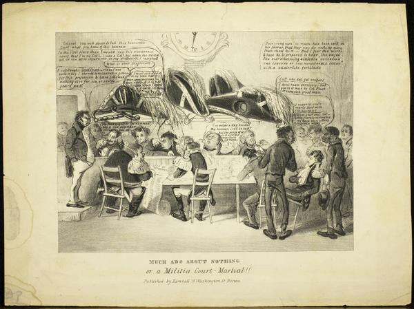 Spoof on the decadence and pretensions of the American local militiamen of the Jacksonian era showing a courtmartial of a militiaman. Several white officers sit around a table, many dozing, others commenting on the trial's length, stipend, and eventual outcome. Behind them rest oversize militia hats and a sword inscribed in Latin, "Guided by Patriotism." Two African American men, portrayed in racist caricature and speaking in the vernacular, presume that the officer holding the "List of Witnesses" and who is inquiring about the defendant’s profession "...mus be Col. Pluck or some sich great man." The defendant claims that he is "a self taught gentleman" who "showed considerable genius for this profession." Col. Pluck was an illiterate hostler elected colonel of the 84th Pennsylvania militia in a controversial election in 1824.