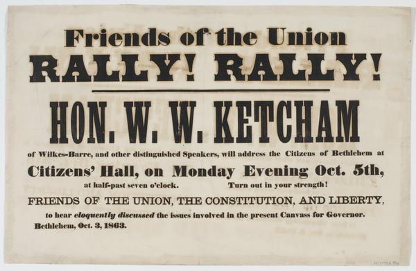 Friends of the Union rally! Rally! : Hon. W.W. Ketcham of Wilkes-Barre, and other distinguished speakers, will address the citizens of Bethlehem at Citizens' Hall, on Monday evening Oct. 5th, at half-past seven o'clock. Turn out in your strength! Friends of the Union, the Constitution, and liberty, to hear eloquently discussed the issues involved in the present canvass for governor. Bethlehem, Oct. 3, 1863.