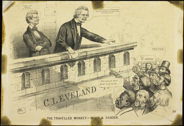 Cartoon depicting two unidentified white men, attired in suits, on the balcony of the "Cleveland Hotel" in front of a hostile crowd calling out "Traitor" and "You be Damned." The speaker clutches a handkerchief and the bannister of the balcony as he tries to placate the crowd by stating it is their "Congress that is trying to break up the Government." The man beside him in the left smugly comments that he hopes the mayor is in town. An African American man in the crowd, portrayed in racist caricature, taunts the speaker, "How about that $400 Gold watch."