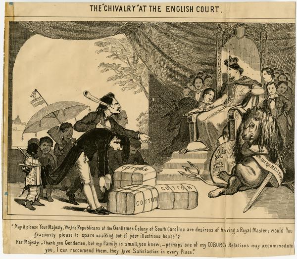 from the "Gentlemen colony of South Carolina" asking Queen Victoria if she can spare a King. The South Carolinians stand before