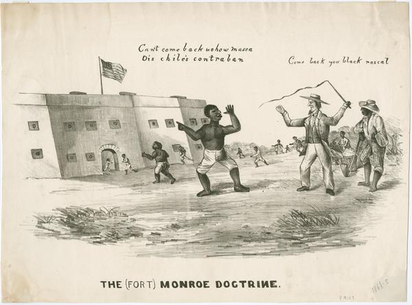 Abolitionist cartoon depicting enslaved African Americans fleeing to Fort Monroe, which was occupied by Union General Benjamin F. Butler who had declared freedom seekers to be "contraband" of war. In the right, a white man Virginia enslaver brandishes a whip and says, "come back you black rascal." A bare-chested, barefooted, African American man attired in white shorts, responds in the vernacular, "can't come back nohow massa Dis chile's contraban." To the right of the enslaver, a barefooted African American man, attired in a brimmed hat, a white collared shirt, and striped pants with the cuffs rolled up, watches as he leans on a hoe. A number of other African American freedom seekers run toward the Fort, including a woman with a child.